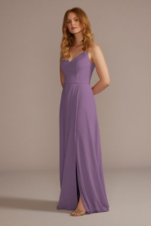 This chiffon V-neck bridesmaid dress is simple in the front with a statement tie back. Features side pockets.