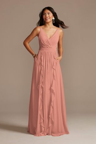 You'll give off boho vibes in this chiffon bridesmaid dress with a surplice V-neck bodice and pretty ruffles.