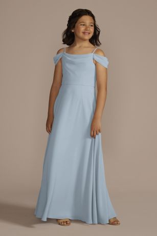 Swag sleeves and a cowl neckline make this chiffon junior bridesmaid dress super sweet.