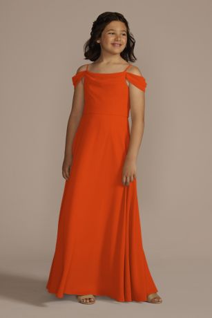 Swag sleeves and a cowl neckline make this chiffon junior bridesmaid dress super sweet.