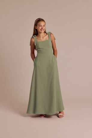 A charming, flowy silhouette with delicate bow-adorned straps, this chiffon A-line junior dress offers a light and effortless style perfect for any occasion. Remove the bows for a different look! A smocked back keeps the style comfy.