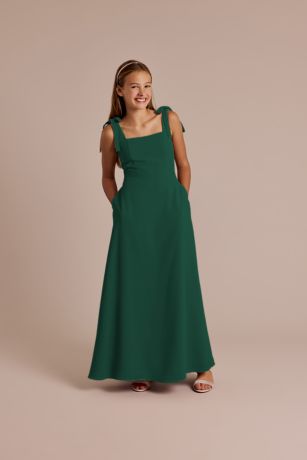 A charming, flowy silhouette with delicate bow-adorned straps, this chiffon A-line junior dress offers a light and effortless style perfect for any occasion. Remove the bows for a different look! A smocked back keeps the style comfy.