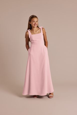 A charming, flowy silhouette with delicate bow-adorned straps, this chiffon A-line junior dress offers a light and effortless style perfect for any occasion. Remove the bows for a different look! A smocked back keeps the style comfy.