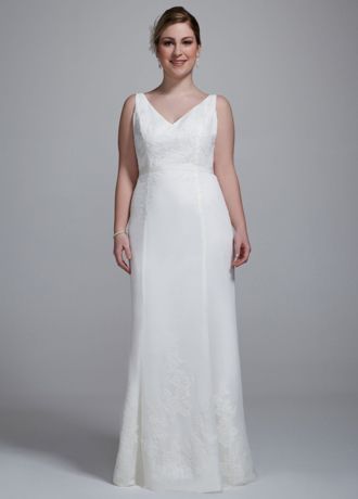 - Soft sheath gown offers exquisite lace applique details and a gorgeous ruffled back for a textured and dimensional look.