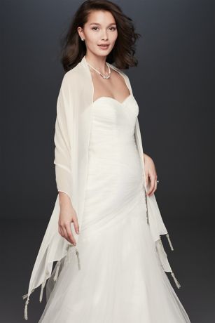 Intricately beaded fringe tassels trim the edges of this sheer chiffon wrap, perfectly suited for any special occasion.