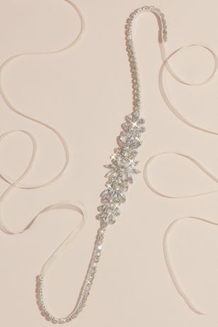 Marquise and teardrop-cut crystals burst from the center of this show-stopping sash. Rhinestones trail from either side of the embellishment to finish the look.