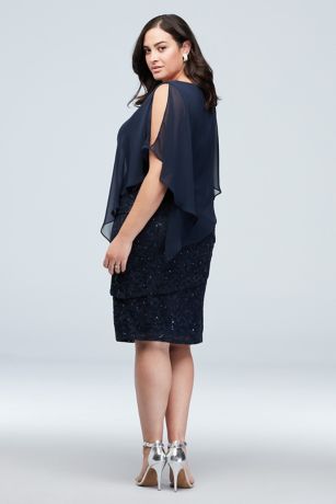 Get the party started in this festive knee-length glittery lace dress. Show a little skin with the sheer chiffon asymmetric capelet, finished with cold shoulder cut outs.