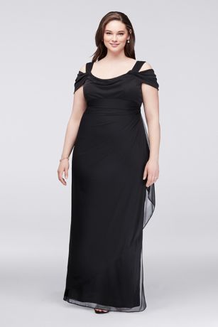 The combination of draped sleeves on a cold-shoulder silhouette creates a gorgeous, face-framing focal point on this flatteringly ruched, plus-size mesh gown.