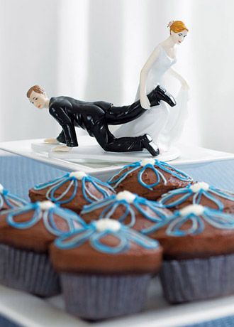 Comical Couple with the Bride "Having the Upper Hand" in hand painted porcelain. A novel approach to top your cake or cup cake tower.