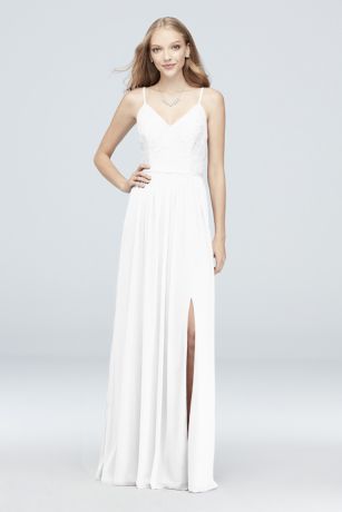 With a graceful feel, this corded lace and mesh slit-skirt bridesmaid dress will practically float down the aisle. Skinny spaghetti straps, a V-neck, and a grosgrain ribbon waist complete the romantic vibe.