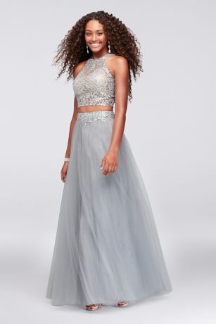 Metallic corded lace appliques give floral detail to the illusion bodice and waistline of this two-piece tulle ball gown. Allover silver beading adds extra glam.