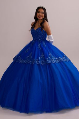 Mesmerize your guests in this vibrant quinceanera gown, featuring sparkly sequin-trimmed appliques and a six-layer tulle skirt. The matching bolero adds a pretty layer and can be easily removed for pictures or dancing!