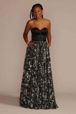 With a glitter cosmic skirt designed to imitate a starry sky, this ball gown guarantees the night is yours! Shine bright at prom or your next special occasion with a structured corset bodice complete with detachable straps for a two-in-one look.