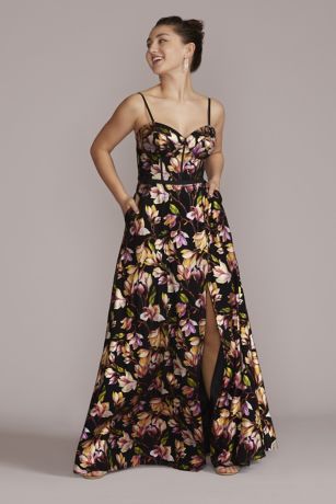 With a corset bodice and sexy skirt slit, this blooming A-line gown transforms from garden party chic to red carpet ready.