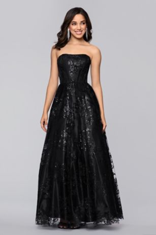 This glittering ball gown features a strapless corset bodice gives way to a ball gown skirt. Finished with allover sparkle, it's a show-stopping choice for an unforgettable entrance at prom or another special event.