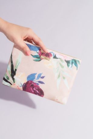 Stash your makeup or keep essentials close in a bigger bag with this lovely canvas and satin floral-printed pouch.