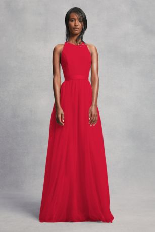 A luxurious bridesmaid dress from White by Vera Wang, featuring a high-neck crepe bodice, a flowing tulle skirt, and a striking T-back detail.