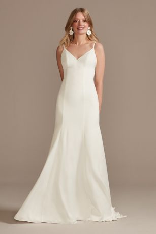 Ideal for the chic, understated bride, this 90s-inspired slip dress is crafted of crepe-back satin and detailed with a V-neckline and spaghetti straps. The simplicity of this dress allows you to personalize your look with accessories and outerwear.