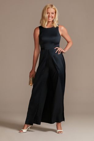 This effortlessly glamorous jumpsuit is simply stunning. A satin overskirt falls from the satin bodice, creating a memorable draping moment.