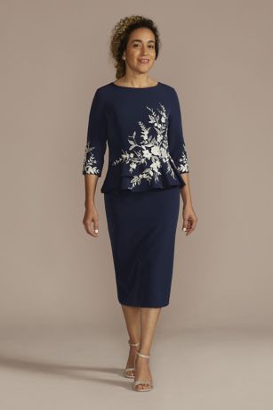 Any mother of the bride or groom will celebrate in style wearing this elegant crepe dress, designed with a flattering peplum and beautiful floral embroidery.
