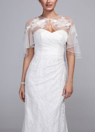 - Crinkle chiffon cape features eye-catching lace appliques.