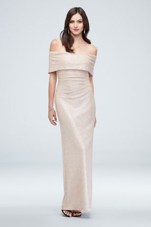 Sleek and slimming, you'll look radiant in this glamorous metallic off-the-shoulder gown. Details like crinkle fabric, ruching at the waist, and a slit skirt instantly elongate the body and flatter your figure.