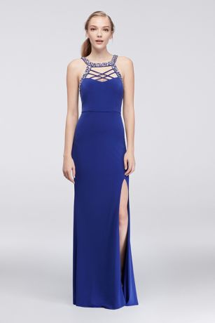 A strappy neckline, framed by bands of iridescent gems, takes center stage on this long jersey sheath dress.