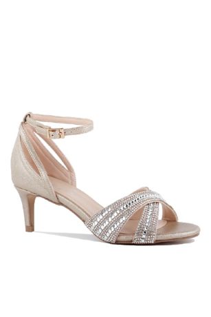 These dressy low-heel sandals dazzle with crisscross crystal straps and a shimmery finish.