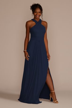 A crisscross neckline and ruched waist give this long, soft mesh bridesmaid dress a goddess-inspired vibe. Finished with a slit in the skirt for extra ease.