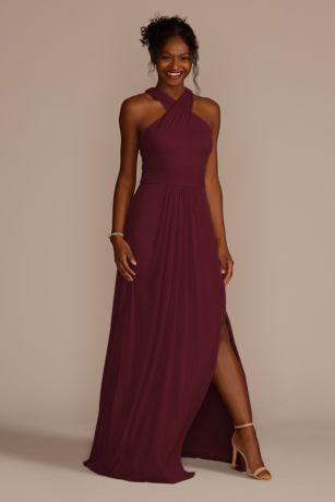 A crisscross neckline and ruched waist give this long, soft mesh bridesmaid dress a goddess-inspired vibe. Finished with a slit in the skirt for extra ease.