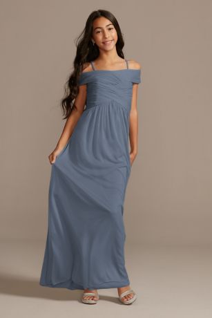 This mesh junior bridesmaid dress features off the shoulder sleeves that create a ruched crisscross bodice. Spaghetti straps complete the look.