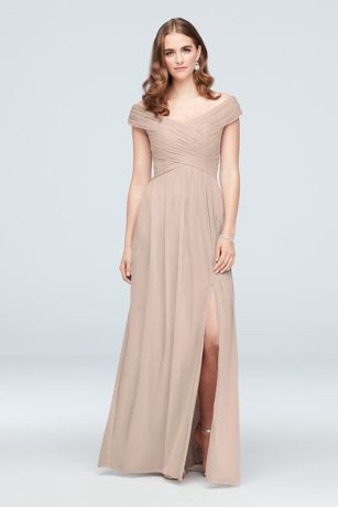 This stunning Crisscross Off-the-Shoulder Mesh Bridesmaid Dress from David's Bridal is the perfect choice for any bridal party. The off-the-shoulder neckline adds a touch of elegance, while the crisscross detailing on the bodice creates a flattering silhouette. The mesh fabric is lightweight and comfortable, making it easy to wear all day and night. Whether you're a bridesmaid or a guest, this dress is sure to turn heads at any wedding or special event. Pair it with heels and statement jewelry for a complete look that is both chic and sophisticated. Choose from a variety of colors to match the wedding theme and feel confident and beautiful in this stylish bridesmaid dress.