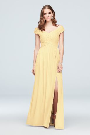 This stunning Crisscross Off-the-Shoulder Mesh Bridesmaid Dress from David's Bridal is the perfect choice for any bridal party. The off-the-shoulder neckline adds a touch of elegance, while the crisscross detailing on the bodice creates a flattering silhouette. The mesh fabric is lightweight and comfortable, making it easy to wear all day and night. Whether you're a bridesmaid or a guest, this dress is sure to turn heads at any wedding or special event. Pair it with heels and statement jewelry for a complete look that is both chic and sophisticated. Choose from a variety of colors to match the wedding theme and feel confident and beautiful in this stylish bridesmaid dress.
