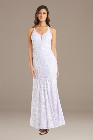 No matter which way you turn, there's something new to discover on this long sequin dress! Sequins, a sweetheart neckline, and a crisscross strappy back complete the look.