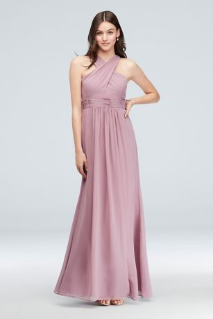The crossover halter neckline and pleated waistband of this chiffon bridesmaid dress add sophisticated detail to a classic silhouette.