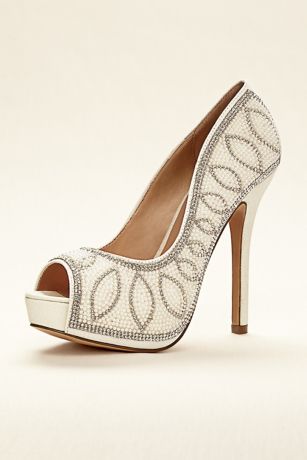 - High heel peep toe pumps feature pearl and crystal embellishment.