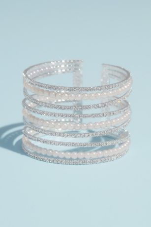 This luxe cuff bracelet will add a touch of opulent sophistication to your occasion look with three strands of pearls framed with rows of bright-shining, solitaire-cut crystals.