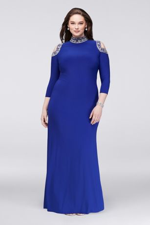 So simple, so chic: This high-neck, cold shoulder dress is both demurely covered up and dynamically beaded with bold crystals.