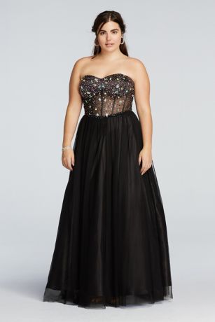 - Simple floor length tulle ball gown skirt completes this dress for a memorable Prom look.