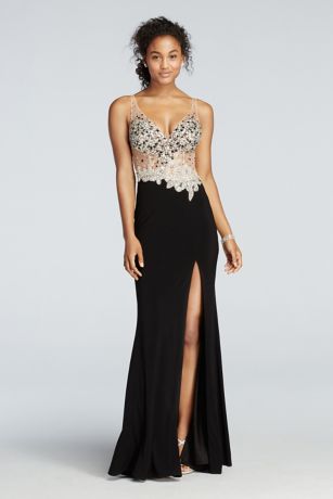 - This unique dress features an illusion tank bodice that's heavily encrusted with high-shining crystals, complete with gorgeous floral lace applique detail at the waist.