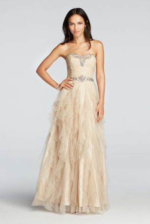 • Tiered ruffle ball gown skirt adds the perfect touch of drama for a memorable Prom look.
