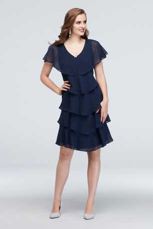 A faux capelet with sheer fluttering sleeves and crystal closure top this stunning knee-length dress with cascading tiers of georgette ruffles.