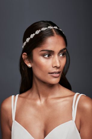 A chain of rhinestone daisies, finished with faux-leather ties, is the perfect hair accessory for a boho-glam bride. Wear as a headband or remove the ribbons to wear as a hair vine.