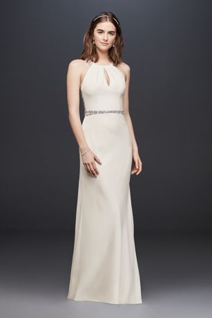Featuring a glamorous draped halter neckline and waist encrusted with crystals, this bias-cut crepe gown is reminiscent of the golden days of Hollywood. Turn around for a stunning view: the illusion back is ornately embellished with crystal and pearl beading. A lustrous charmeuse lining is a special hidden detail, making this gown feel as lovely as it looks.
