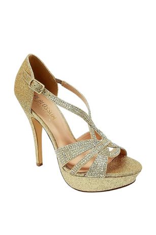 This high heel platform sandal is sure to turn heads with its braided peep toe, crisscross straps, and brilliant rhinestone detailing.