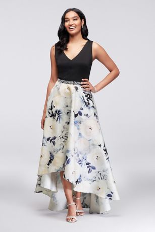 Printed petals bloom on this ball gown's high-low mikado skirt, while a band of sparkling crystal cinches the waistline. A colorblocked tank bodice adds an elegant pause point.