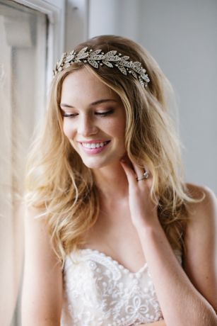 This beautifully bold halo headband features a laurel leaf design covered in hand-wired crystals.
