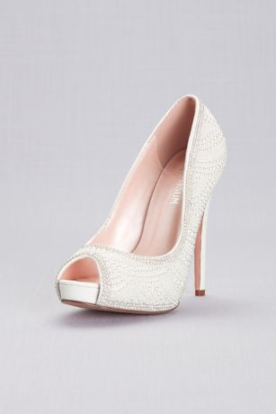 Dazzling sparkle makes a lasting impression on these platform peep-toe stiletto heels, perfect for walking down the aisle.