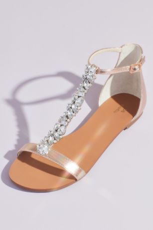 Turn heads in these fashion forward flat sandals with shimmering metallic straps and eye-catching clusters of gem-cut crystals along the T-strap.