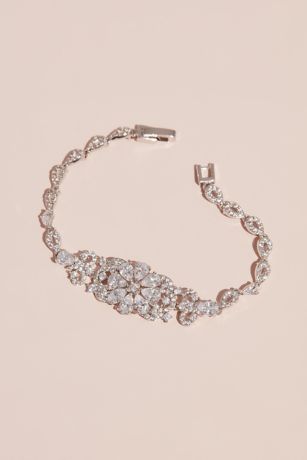 Perfect for any vintage jewelry fan, this crystal flower bracelet has an antique feel. The large central crystal flower is framed with smaller pave tear drop links to form the bracelet.